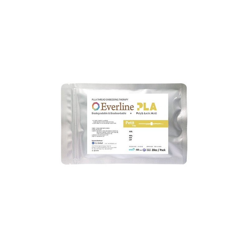 Everline PLA is using a safe substance PLLA approved by US FDA. Everline PLA petit is barbed thin threads inserted into thin needle. PLLA(Poly L-Lactice Acid) sitmulates the production of collagen so that the skin is strengthened. PLLA has higher tension than PDO, so it can maintain the lifting effect for a long time.